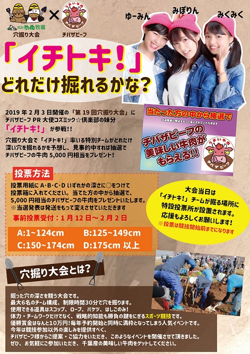 30分間でどれだけ深い穴が掘れるかを競う立派な競技「第19回全国穴掘り大会」が成田ゆめ牧場にて開催されました。チバザビーフ協議会としては昨年に続き2回目の協賛です。