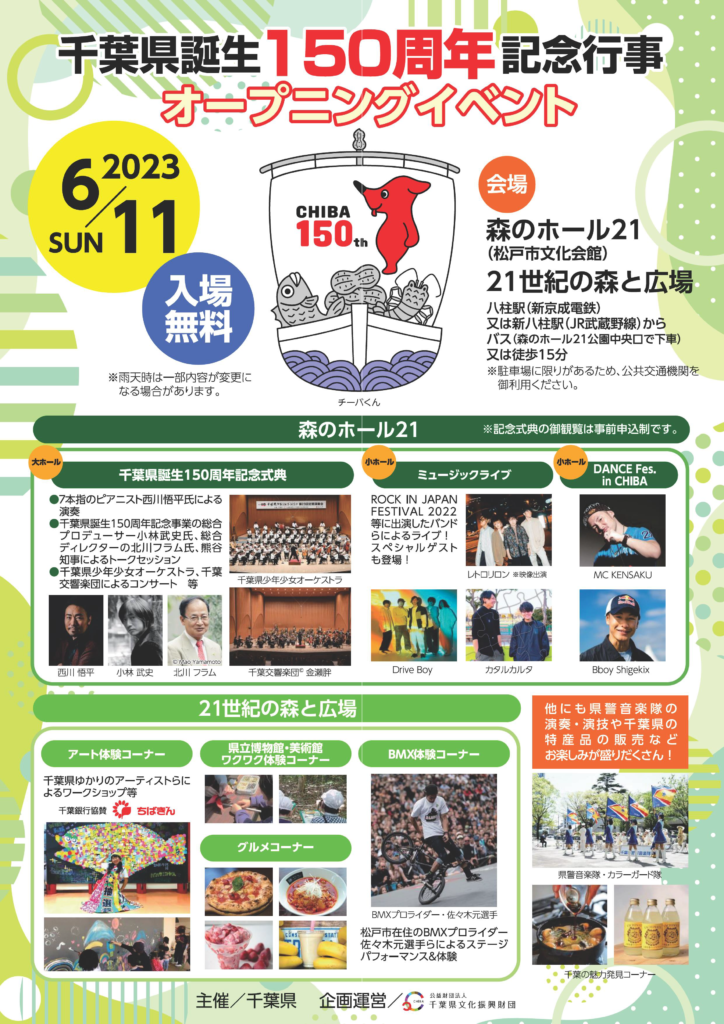 令和5年は、千葉県が明治6年に誕生してから、150年の節目の年となり、本年6月から来年6月までの間、「県誕生から150年を振り返り、続いていく未来(100年後)に思いを馳せる」をテーマに、県内各地で様々な催しが実施されていきます。